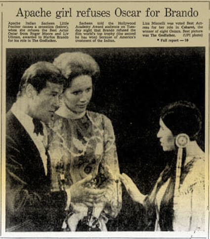 بحثت منذ سنوات مضت عن خطاب قبول براندو لجائزة أفضل ممثل عن فيلم “الأب الروحي” عام 1973 فتبين لي أن براندو قاطع الحفل احتجاجا على عنصرية الولايات المتحدة في التعامل مع الهنود الحمر ورفض تسلم الجائزة وأرسل ساشين ‘الريشة الصغيرة’، ناشطة من هنود الأپاتشي، لتقرأ بيان احتجاجه بدلا منه فكان ذلك البيان هو الفاتح لتحويل منصة تسليم الجوائز وتسلمها إلى فرصة، مساحة تعبير، منبر يعلن منه الفنانون عن مواقفهم السياسية والإنسانية بدلا من الاكتفاء بشكر مؤلف الفيلم ومخرجه ومنتجه.