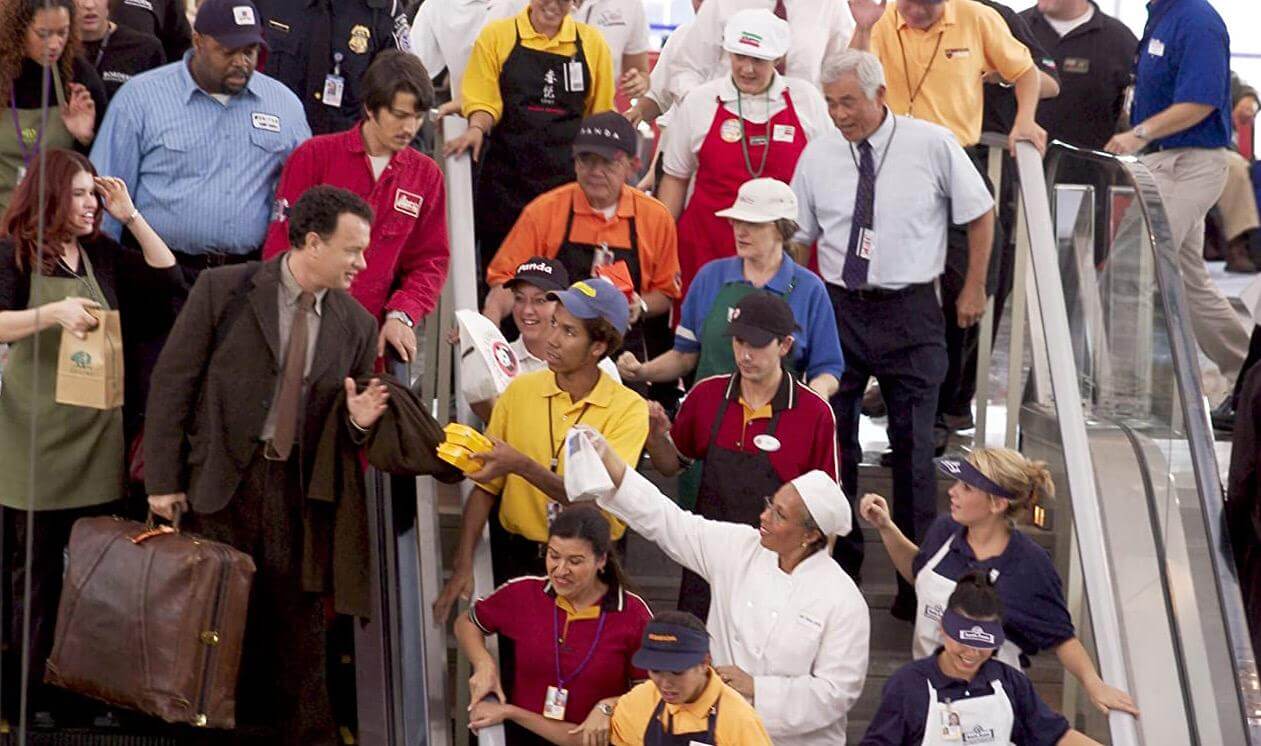 ثم يقدم “توم هانكس” في عام 2004 فيلمه الثالث مع “ستيفن سبيلبرج” بعنوان The Terminal والذي تدور أحداثه داخل مطار كينيدي بنيويورك ، ويجسد “هانكس” واحدة من أروع الشخصيات التي قدمها في مشواره الفني وهي شخصية “فيكتور نافورسكي” هذا الرجل البسيط الذي جاء من دولة بأوروبا الشرقية غير مستقرة سياسياً آنذاك (المجر) ولم تكن أوراق سفره تتوافق مع قوانين الدخول لأمريكا ، وما كانت زيارته لأمريكا إلا وفاءً لوالده الذي كان عاشقاً لموسيقى “الجاز” الأمريكية وكان قد حصل على توقيعات كل نجوم الجاز الذين رآهم في جريدة ببلاده (وعددهم الإجمالي 57 موسيقي) فيما عدا عضواً واحداً هو عازف الساكسفون “بيني جولسون” وقد فارق والد “فيكتور” الحياة قبل الحصول على التوقيع الأخير الذي تمناه ، ويتخذ المسافر “فيكتور” من المطار بيتاً له ويتعرف هناك على العاملين داخل المطار ويخلق صداقة معهم. وقد تكلف إنتاج فيلم Terminal حوالي 60 مليون دولار وجمع عالمياً حوالي 220 مليون دولار.