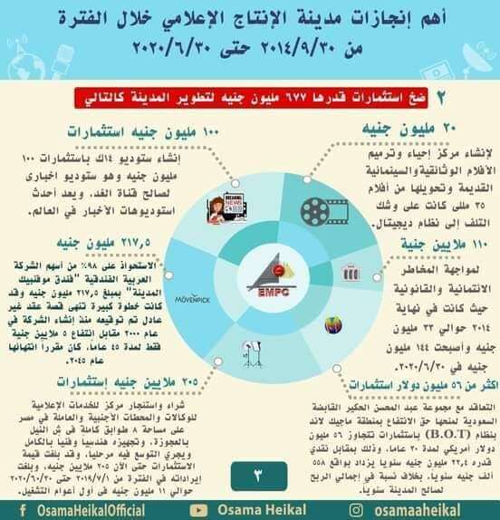 الغريب أنه فى شهر أكتوبر 2020، نشر الوزير على صفحته الشخصية والصفحة الرسمية لوزارة الدولة للإعلام انفوجراف تحت عنوان (أهم انجازات مدينة الإنتاج الإعلامى حتى 30 يوينو 2020 )، والذي يكشف أنه تم شراء واستئجار مركز الخدمات الإعلامية للوكالات والمحطات الأجنبية والعاملة فى مصر على 8 طوابق كاملة فى شارع النيل بالعجوزة، وتجهيزه هندسيا وفنيا بالكامل ويجرى التوسع فيه مرحلياً، وقد بلغت قيمة الإستثمارات فيه حتى الآن 205 ملايين جنيه، وبلغت إيراداته فى الفترة من 1 يوليو 2019 وحتى 30 يونيو 2020 حوالى 11 مليون جنيه فى أول أعوام التشغيل.