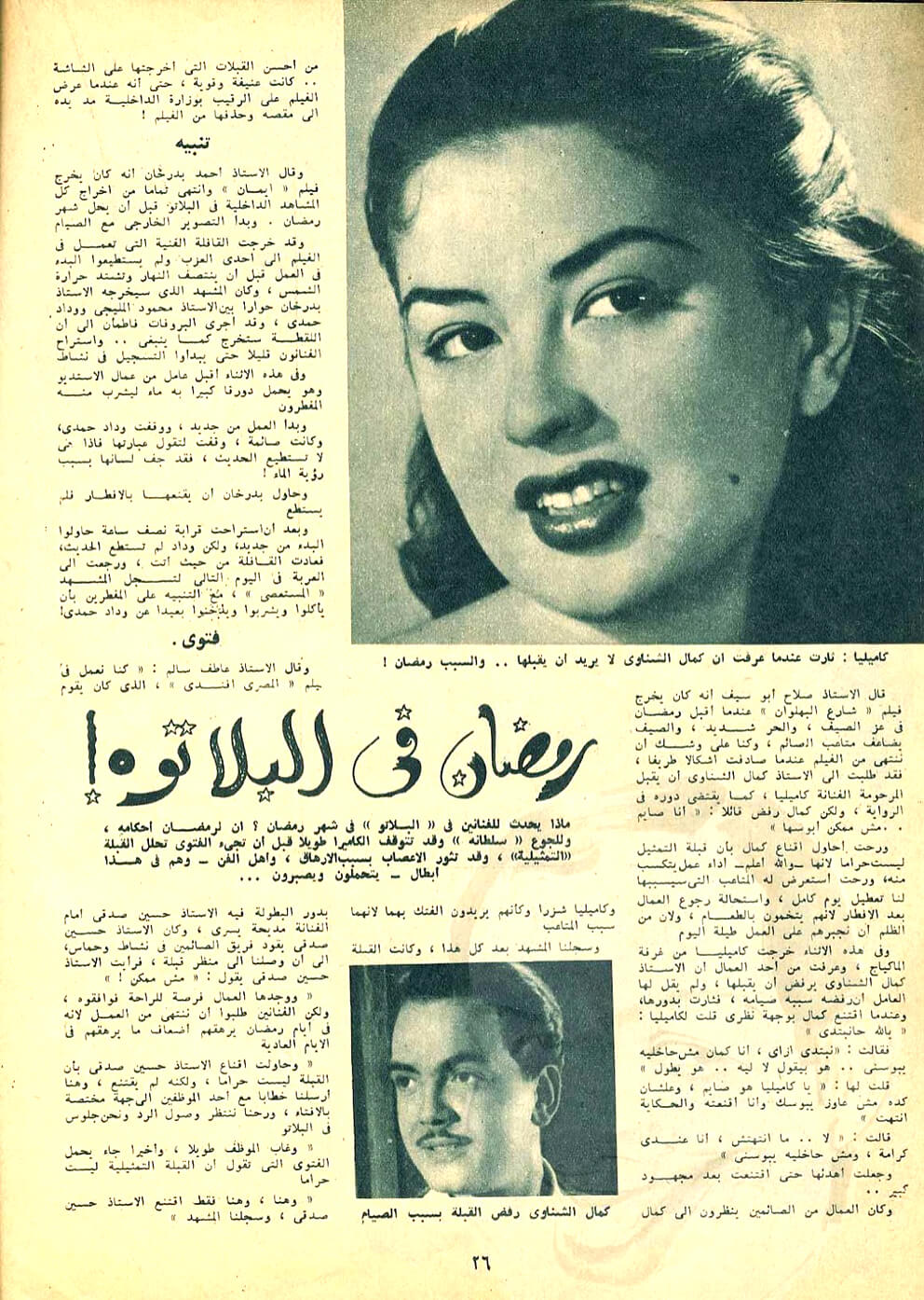 وأثناء ذلك الحوار خرجت كامليا من غرفة المكياج وعرفت من أحد العمال إن النجم الشاب يرفض تقبيلها، فصرخت وبدأت تسب وتلعن وتقول: (هو مين ده اللي يرفض يبوسني هو يطول! أنا اللي مش هخليه يقرب مني)، وتدخل (أبوسيف) وشرح لها أن (الشناوي) رفض تقبيلها فقط بسبب الصيام، وليس لسببا آخر، ونظرا لطيبة قلبها هدأت واستكملت التصوير.