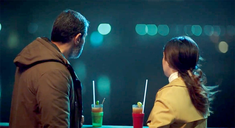 على كورنيش النيل في قلب الليل حيث الشتاء والهدوء والسكينة وصوت أم كلثوم القادم من بعيد، يقترب (جلال) من ابنته شهد ويقدم لها كوبا من (حمص الشام) قائلا : اتفضلي.