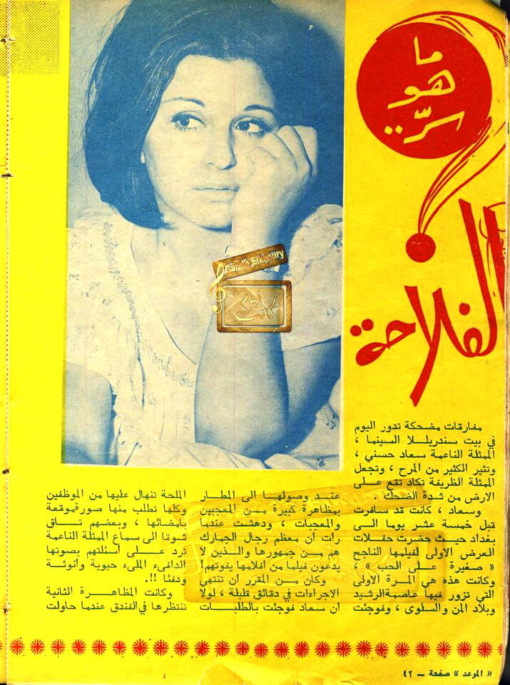 نشرت مجلة (الموعد) اللبنانية عام 1966 موضوعا طريفا عن سندريلا السينما المصرية (سعاد حسني)، بعنوان (سر الفلاحة التى احتلت منزل سعاد حسني!) وبمناسبة الذكرى العشرين لرحيل أيقونة البهجة والشجن والاستعراض، نعيد نشر بعض مما جاء فيه، حيث تحدثت المجلة باستفاضة عن رحلة (سعاد حسني) إلى العراق والاستقبال الحافل لها في كل مكان تخطو فيه، حتى أن الجماهير الغفيرة كانت تنتظرها على باب الفندق الذي تقيم فيه، ولا تبارحه حتى الساعات الأولى من نهار اليوم الجديد.