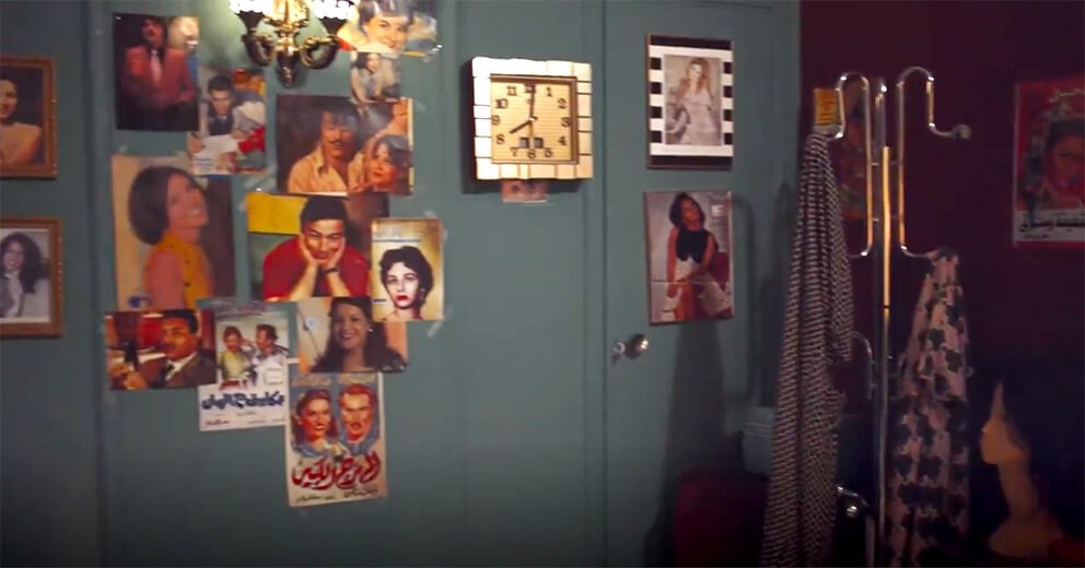 تشير بيدها إلى حائط صور ذكريات النجوم قائلة: بص لهادي .. بص لهادول ثم تتجه إلى الحائط تتلمس صورة سعاد حسني في محاولة لتلبس روحها ثم سعاد العبد الله وفاتن حمامة، وفي شجن تقول: أبي أحب وانحب .. ابي اتزوج اللي احبه ويحبني، وتضع يدها على صورة فاتن حمامة وعمر الشريف قائلة مثل فاتن حمامة.