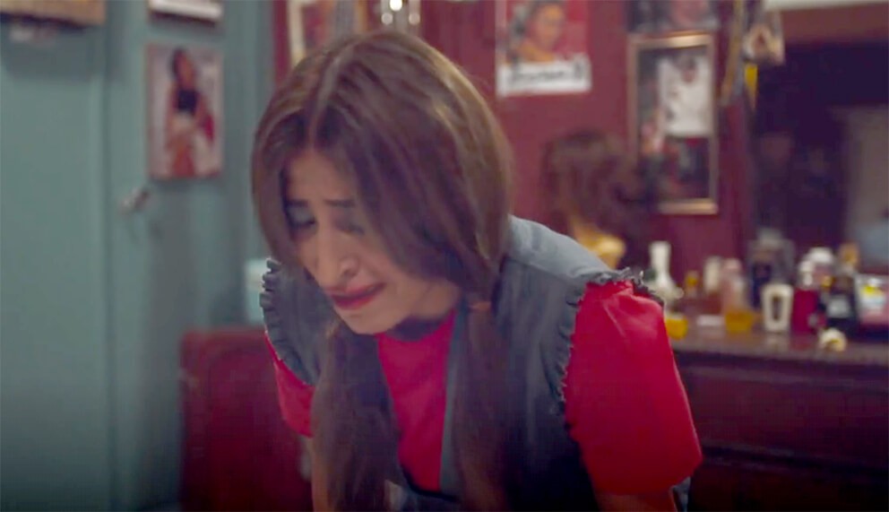 لكن أداءها يميل إلى الجدية والبراعة أكثر حين تعود لغرفتها مفزوعة خائفة وتقوم بإطاحة أدوات تجمليها ثم تجلس على سريرها تبكي قائلة : تعبت .. ذهقت .. حتى التعب مني زهق .. تحل ضفائرها وتتجه للكاميرا وتحمل بطاقة في يدها: هذه بطاقة دوامي : اسمي رحمة .. ايدي تلف في حرير وقلبي تقطع شوك وهم .. أداوي الناس وما الاجي اللي يداوي جروحي .. اضمد جروحهم والجرح ساكن فيني .. تري باسوى المستحيل .. والله صعب .. أبي يصير حالي كحال كل الناس.