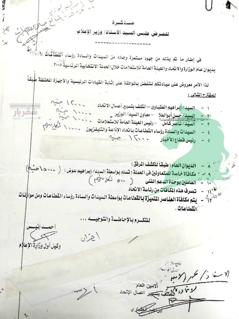 وتصرف هذه المكافات من رئاسة الاتحاد بموجب المذكرة التي أرسلت إلى أنس الفقي وزير الإعلام، فوقع عليها (أوافق) ويضاف السيد وكيل الوزارة، ثم قام أحمد أنيس بالتوقيع فوق المذكرة قائلا : إن الوزير أنس الفقي أمر بأن تكون هذه المبالغ صافي بعد الضرائب، ومن هنا كانت الانتخابات تدر خيرا علي قيادات ماسبيرو/ ما يؤكد أن الفساد ينخر في عظام التليفزيون العتيق في عهد مبارك.