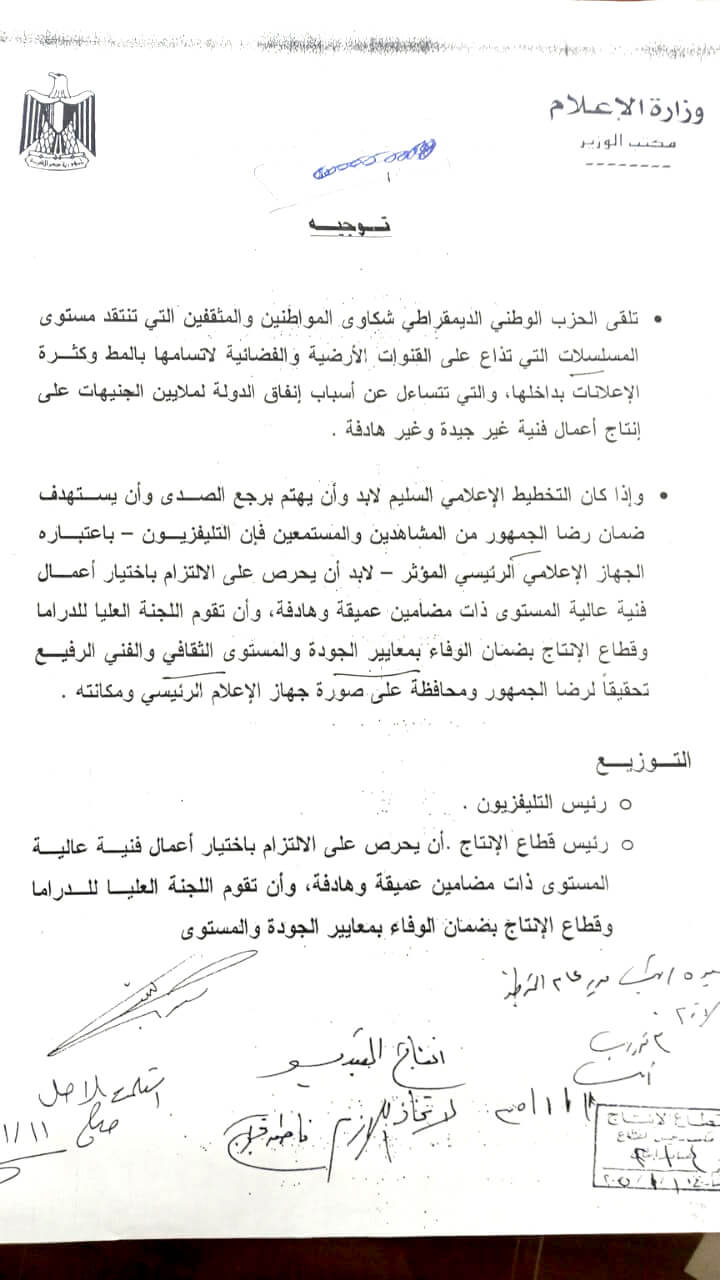 في أول يناير 2005 أرسل أنس الفقي وزير الإعلام توجيها مهما جدا لرئيس قطاع التليفزيون ورئيس قطاع الإنتاج وقتها، قال فيه إن (الحزب الوطني الديمقراطي) تلقي شكاوي من المواطنين والمثقفين تنتقد فيها مستوي المسلسلات التي تذاع على القنوات الأرضية والفضائية متهمة إياها بالمط والتطويل وكثرة الإعلانات داخلها، وهى نفس الشكاوى حول الدراما التي تنتج حاليا.
