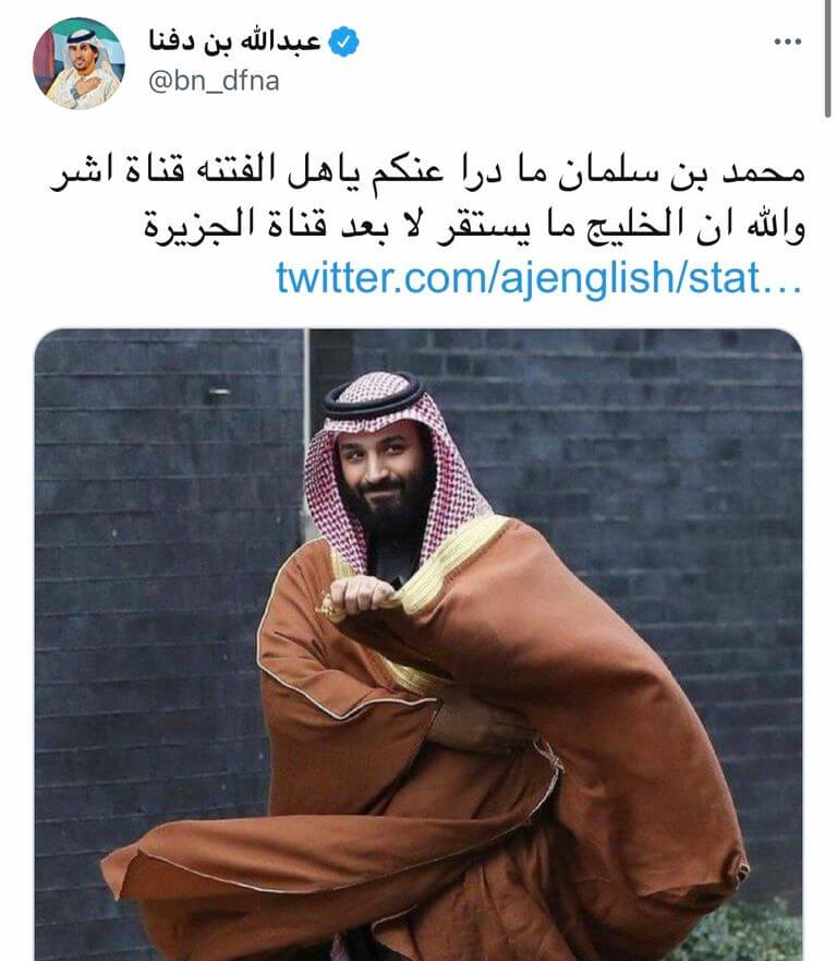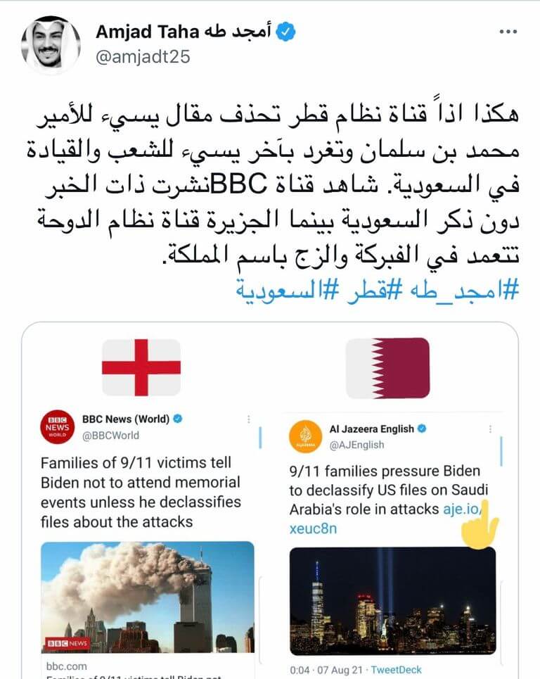 فبالأمس البعيد كانت تهاجم دول التحالف والتي من بينها المملكة العربية السعودية بجانب مصر والإمارات والبحرين، وعلى غير عادتها عادت بالأمس القريب كي تتظاهر بابراز الإنجازات التي تحققت في السعودية خلال الفترة الماضية، حيث أذاعت تقريرا عن تطور العمران لكل من السعودية والكويت والإمارات، حتى أنها قالت بالحرف الواحد في منشورها: (الجزيرة الوثائقية تتمنى لكم يوما مشرقا وسعيدا.. صورة تظهر حجم التطور العمراني والحضاري الذي تعرفه العاصمة السعودية الرياض)، لكنها عادت إلى طبيعتها الشريرة في العداء، عندما أثار نشر حساب قناة الجزيرة على (تويتر) تغريدة مسيئة للأمير محمد بن سلمان، ما سبب غضبا عارما بين المغردين العرب، لم يخمد رغم حذف التغريدة.