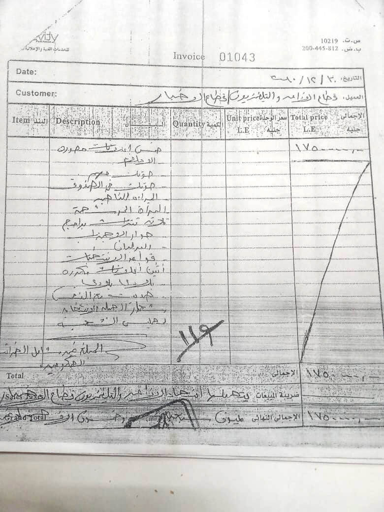 وانتهت المطالبة بكلمة المبلغ غير شامل الضريبة الحكومية ووقع رئيس قطاع الاخبار علي المطالبة ليدفع القطاع المبلغ مجاملة للانتخابات.