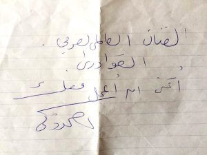 وقرأت له السيناريو، فنادى على الجرسون وقال له : (اديني ورقة وقلم)، فقطع الجرسون ورقة حساب فاضية وكتبلي: (إلى المخرج العالمي العري القوادري أتمنى أن أتعاون معك) عليها العبارة التي تقرأها بتلقائية شديدة، وقبلني وحضني وكان في منتهى الفرح والانتشاء.