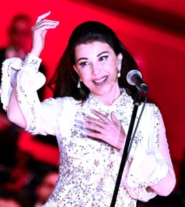 وبعد دقائق قليلة أطلت صاحبة طوق الياسمين الذي لا يذبل (ماجدة الرومي) من شرفة قصر عابدين كالأميرات الملكلية، وهي ترتدي ثوبها الأبيض الطويل المطرز، مجددة أناقتها المعتادة وقالت بعلو صوتها: مساء الخير يا مصر.