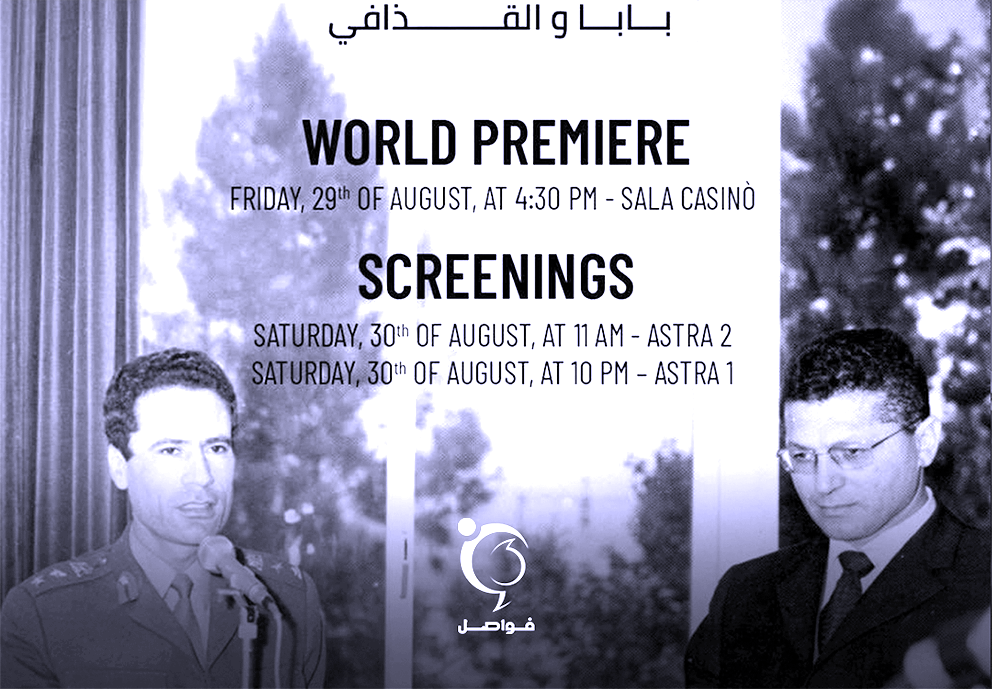 كشفت شركة MAD Solutions عن الإعلان التشويقي الرسمي للفيلم الوثائقي (بابا والقذافي) للمخرجة (جيهان خيوط)، وذلك قبيل عرضه العالمي الأول اليوم 29 أغسطس في مهرجان فينيسيا السينمائي الدولي (27 أغسطس – 6 سبتمبر)، وتتولى MAD Distribution مهام توزيع الفيلم في العالم العربي، بينما تتولى MAD World مبيعاته في باقي أنحاء العالم.