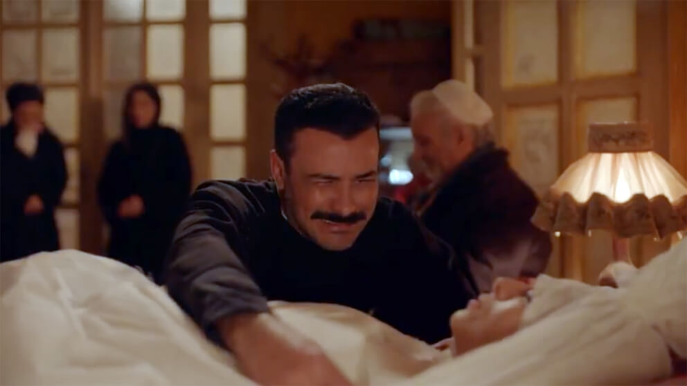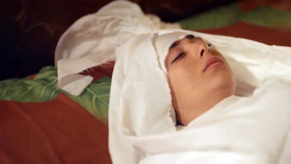 إنه مشهد يجسد كل ألوان التراجيديا السوداء، حيث يدخل حربي أبو رجيلة – الذي يجسده” بعذوبة واحترافية النجم محمد رجب – في زي منتقبة في محاولة للتمويه على البوليس المنتشر خارج المنزل، وتستقبله “سنية”وتؤدي دورها بعفوية وتلقائية “زينة منصور” وتدخله  الغرفة المسجي فيها جثمان أخته “صفية” التي تلعب دورها ببراءة وشفافية الفنانة “هبة مجدي”، ويكشف غطاء وجه متأملا في ذهول “صفية” داخل الكفن، ويدور شريط الذكريات في صورة “فلاش باك”، ليستعرض لحظات من الماضي الجميل له مع أخته التي تلوح بـ “كرافتة” كانت قد أحضرتها له في عيد ميلاده الأخير، ثم تنتقل الكامير إلى طاولة وضعت عليها تورتة عيد الميلاد.