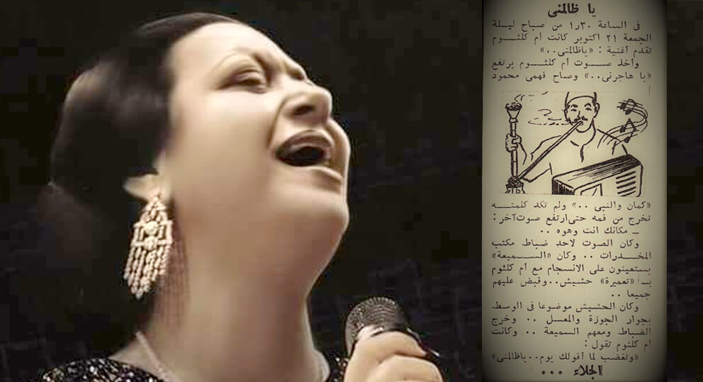 لم يكن العشاق والأحباب فقط هم الذين يتواعدون وينتظرون طلة (كوكب الشرق) كل خميس، فكان هناك أيضا أصحاب (المزاج) والدليل هذا الخبر الذي عثرنا عليه فى إحدى المجلات الفنية عام 1951، وتحديدا بعد تقديم (أم كلثوم) لرائعتها (يا ظالمني)، كلمات المبدع أحمد رامي، وألحان الأستاذ رياض السنباطي، فجاء الخبر الذى نشر فى مجلة (الجلاء) عام 1951 يقول: فى الساعة 1.30 من صباح ليلة الجمعة 21 أكتوبر كانت (أم كلثوم) تقدم أغنيتها الجديدة (يا ظالمني)، وأخذ صوتها يعلو ويرتفع وهى تقول (يا هاجرني)، وفى تلك اللحظة كانت مأمورية مكونة من ضابط ومجموعة من العساكر تمر فى إحدى شوارع (العتبة) ووجدوا جراج سيارات مقفول لكن تخرج منه أصوات!.