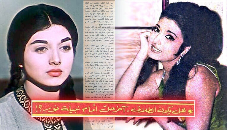 يبدو أن نبيلة نور أو نبيلة عبيد في ساعات الفراغ باتت تردد سؤالا معقولا يطوف أحيانا في خيالها أكثر من مرة في اليوم الواحد، المخرجون لا يسندون إلى أدوار البطولة في أفلامهم لأنهم يغارون من زوجي، وزوجي يرفض أن أمثل في أفلامه حتى لا يقال عنه أنه يخلط بين المصلحة الخاصة والمصلحة العامة فهل يكون طلاقي منه هو الحل الوحيد؟!، وهل إذا خرجت من دنياه يتيح لي الفرصة لأكون بطلة للأفلام التى يخرجها؟!