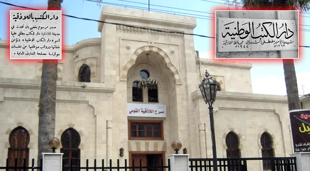 دار الكتب الوطنية، أو المركز الثقافي القديم، أو المكتبة العامة/ قاعة الأديب عبد الله عبد/ للمطالعة، ومكتبة المطالعة للأطفال، وهذه الأخيرة أصبحت أثراً بعد عين، وهى التي قدمت لأطفال الأمس رجال اليوم، ما لم تقدمه جهة أخرى، آنذاك، ثم المسرح القومي في اللاذقية، هى أسماء متعددة لمبنى واحد يتميز بالعراقة والحنين إلى كل ماهو جميل، رغم ما يبثه وضعه المحزن الآن كأنه خزانة مقفلة فارغة، لاشيء بداخلها على الإطلاق سوى صفير الريح وبعض العناكب التي اتخذت من العتمة مكاناً لتنسج بيوتها الواهنة.